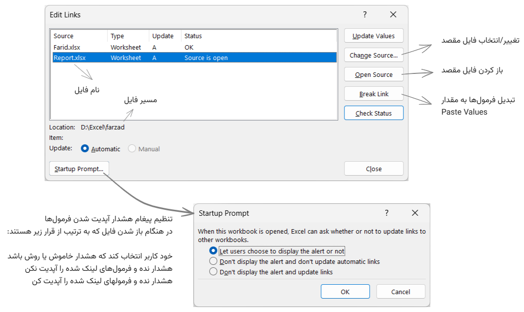 اکسل به صورت پیش فرض علاوه بر فرمول، مقدار (حاصل فرمول) یک سلول را ذخیره میکند و فقط در صورت نیاز (یا به فرمان ما) فرمول را محاسبه میکند. بنابراین اگر فایلی را باز کنیم و فرمولهای لینک شده آن را آپدیت نکنیم، همواره آخرین مقدار محاسبه شده را در آن خواهیم دید.